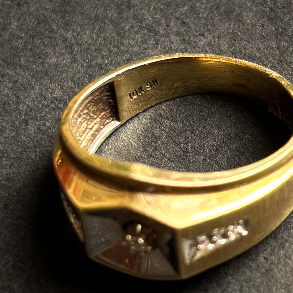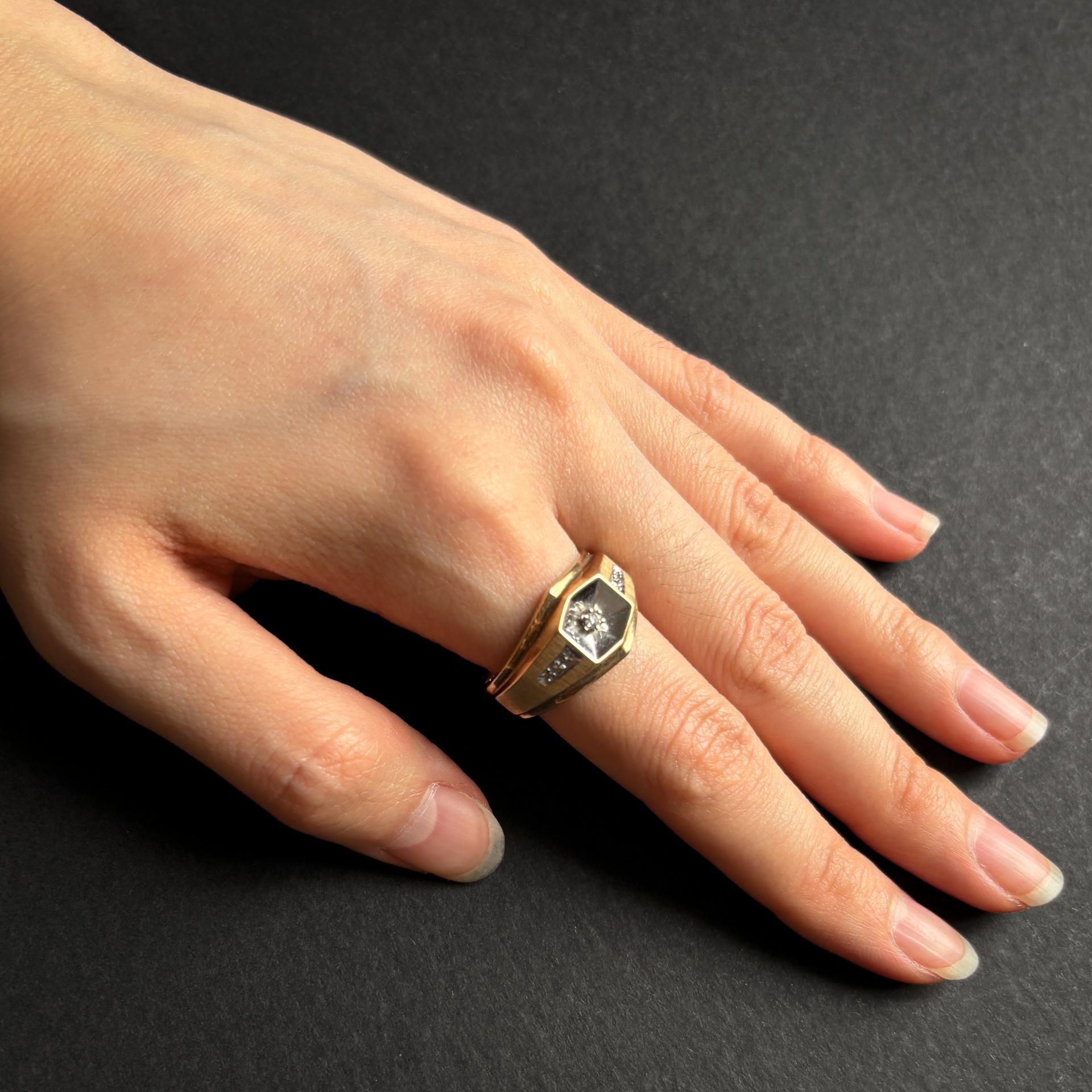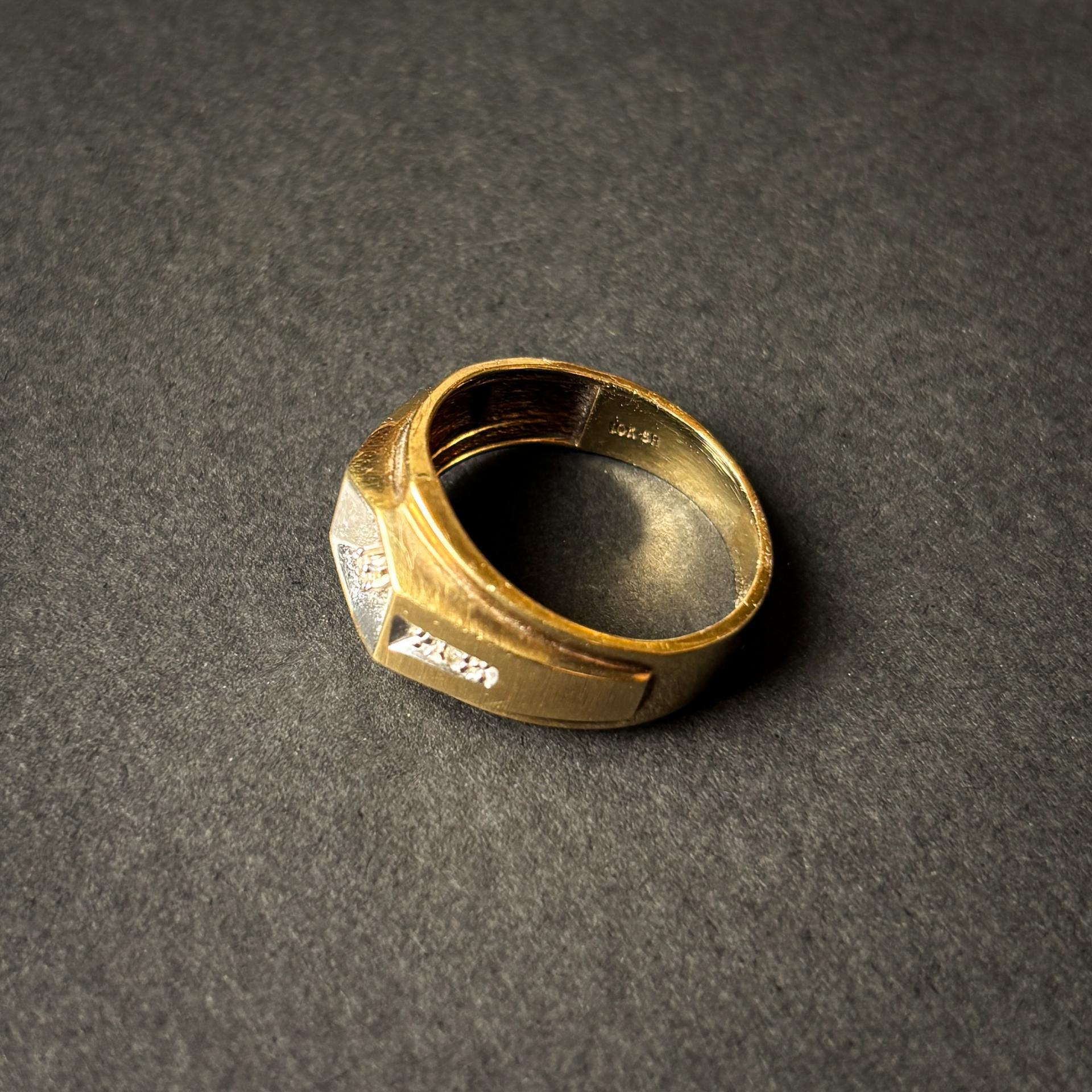 1960년경 미국에서 제작된 다이아몬드 헥사고널 옐로우 남성 반지입니다. 각진 모서리의 입체감과 골드의 두 가지 서로 다른 질감이 어우러져 시각적인 깊이를 더하며, 정제된 분위기를 연출합니다. 반지의 중앙을 중심으로 다이아몬드들이 세팅되어 있으며, 반지 내부에는 10K 골드 각인이 새겨져 있어 소재의 정통성을 확인할 수 있습니다.