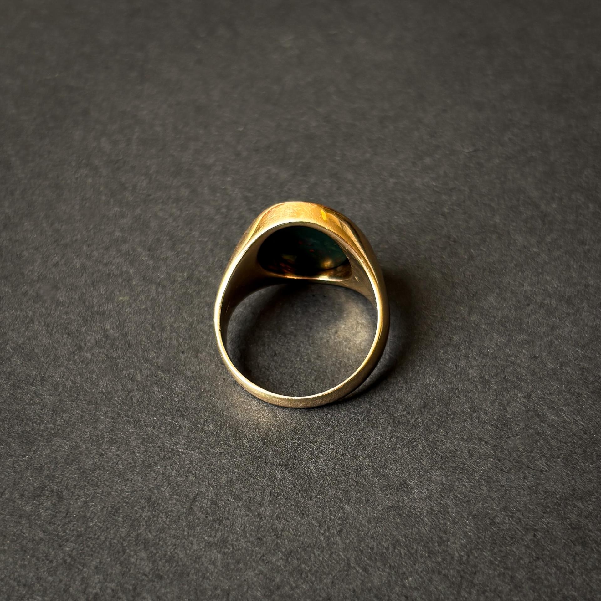 이 시그넷 링은 1900년경 영국에서 제작된 앤틱 골드 링으로, 중심에는 강인함과 생명력의 상징인 블러드스톤(혈석)이 세팅되어 있습니다. 타원형 스톤에는 과거 영국 로열패밀리의 혈통을 상징해온 인타글리오 문양이 정교하게 새겨져 있어, 클래식한 위엄을 줍니다. 반지 내부에는 14K 골드를 나타내는 585 각인이 새겨져 있어 소재와 제작 배경의 정통성을 확인할 수 있습니다.