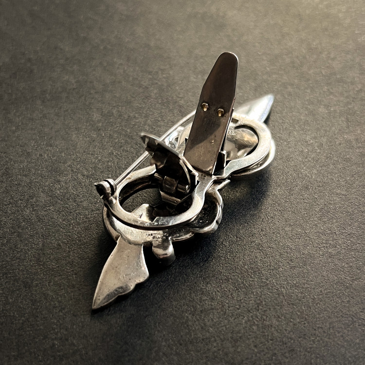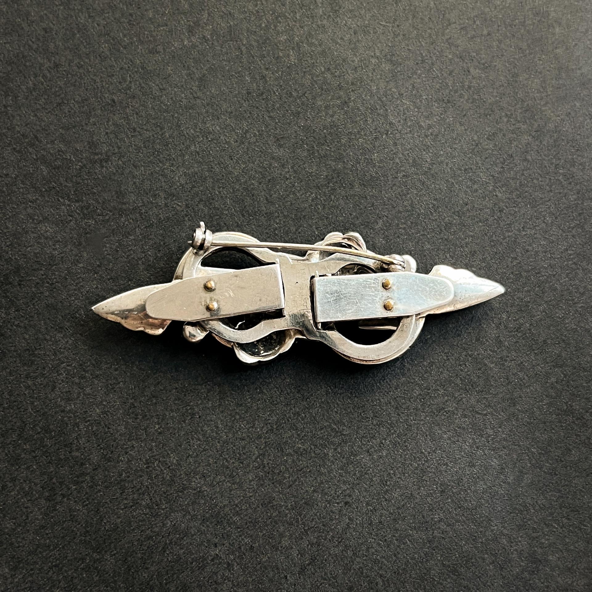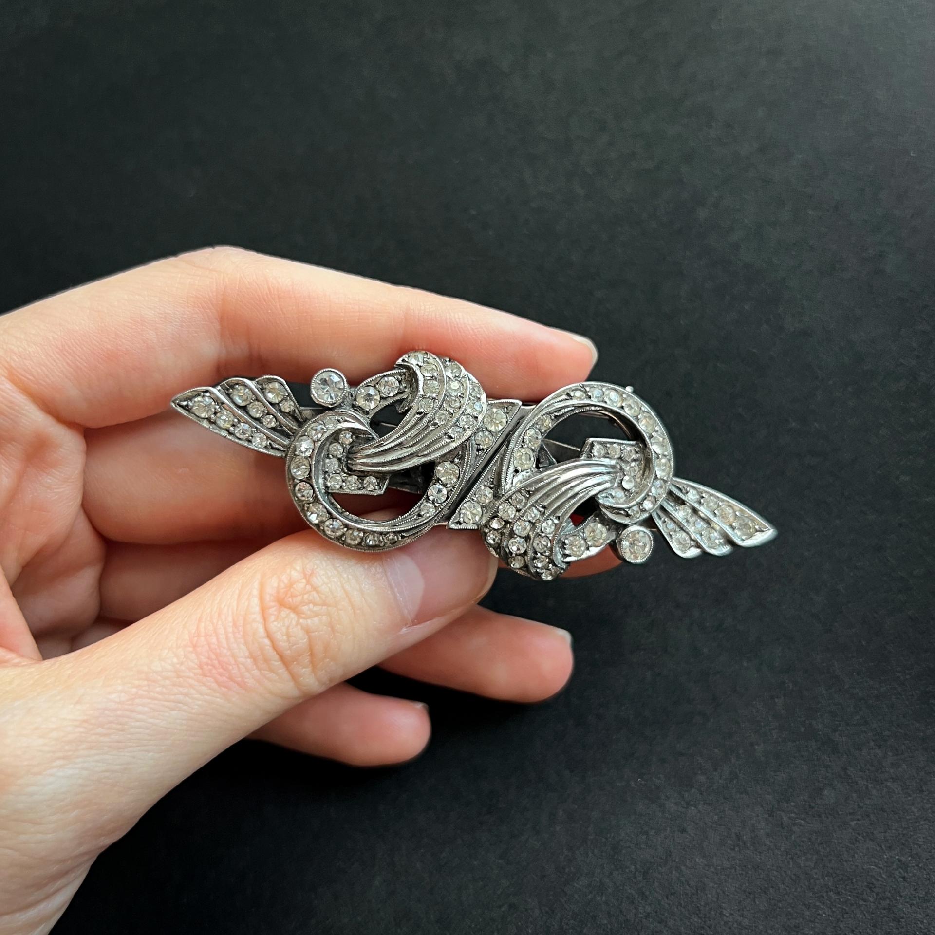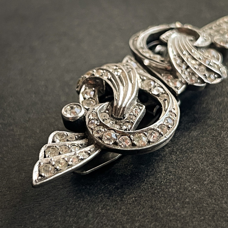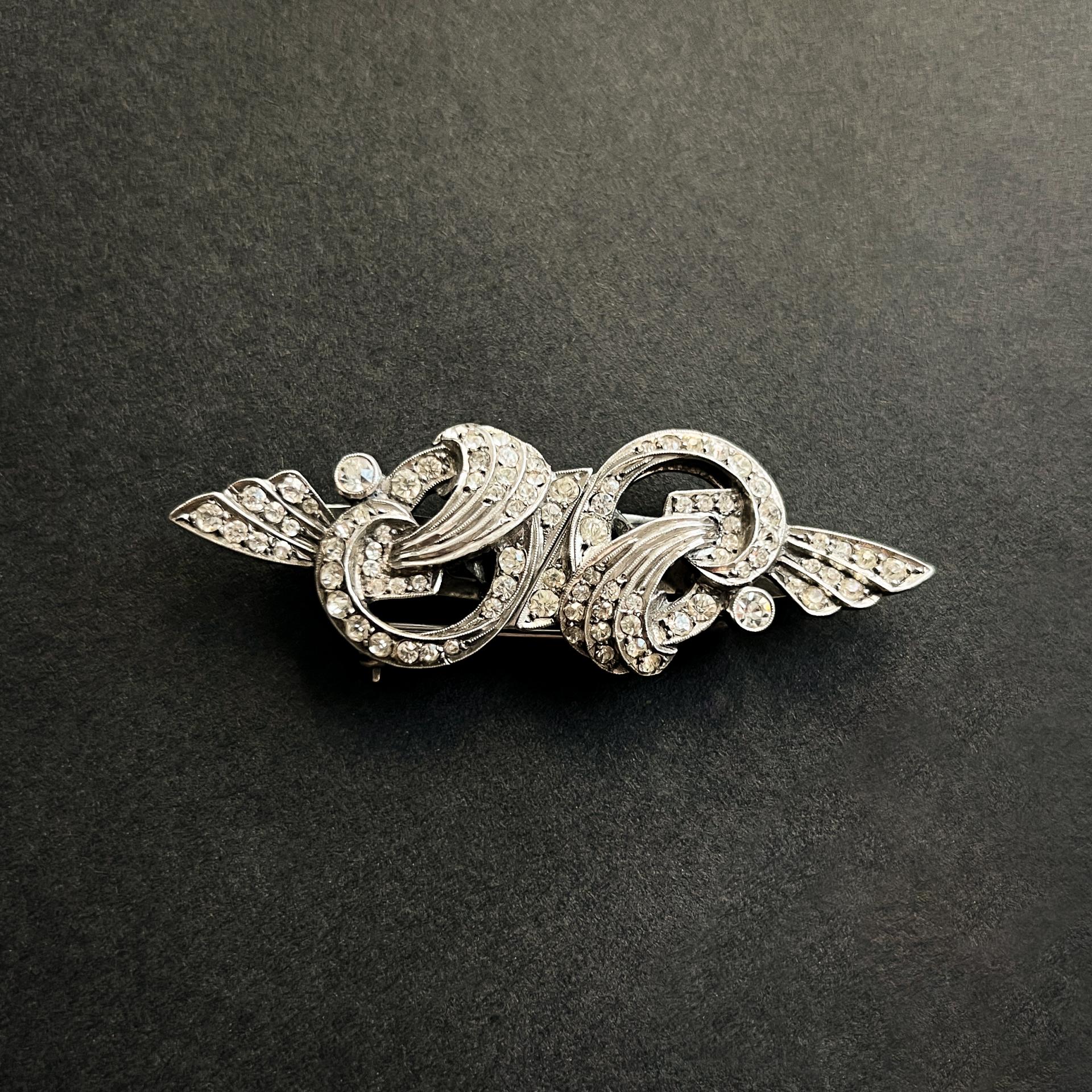 Art Deco Style White Rhinestone Jewelled Silver Brooch Pin, England, 1950s